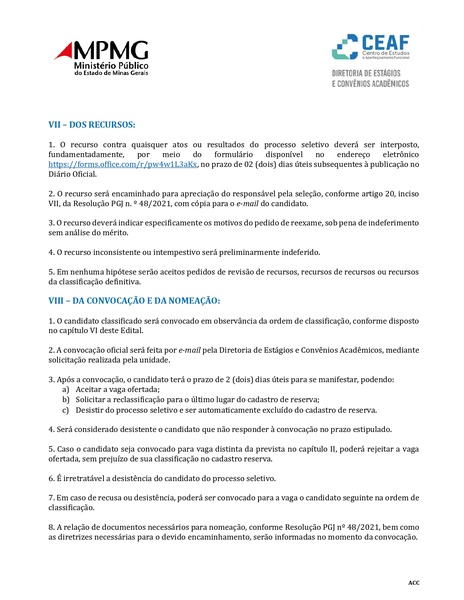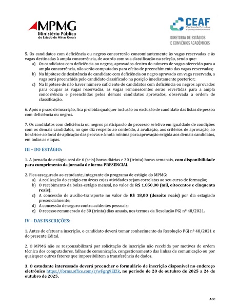 O processo seletivo tem validade de 6 meses, podendo ser prorrogado por igual período, e seguirá estritamente as normas do MPMG e do edital na galeria abaixo