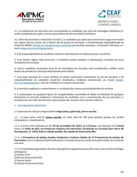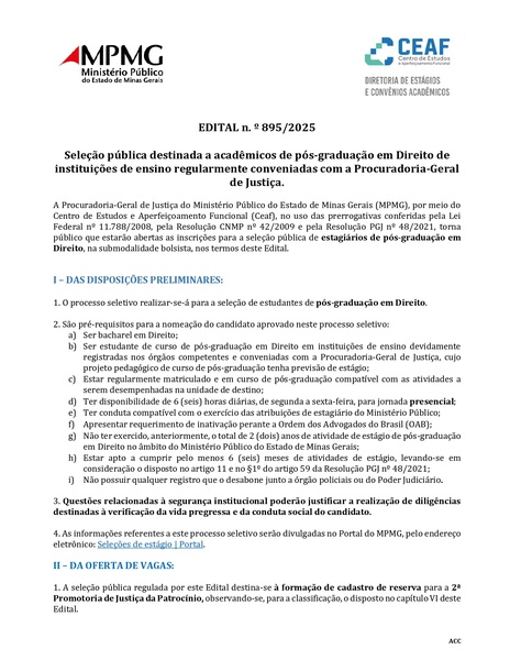 A Procuradoria-Geral de Justiça do Ministério Público de Minas Gerais (MPMG) abriu inscrições para a seleção pública de estagiários de pós-graduação em Direito, na modalidade bolsista, destinada à 2ª Promotoria de Justiça de Patrocínio. O processo seletivo é realizado pelo Centro de Estudos e Aperfeiçoamento Funcional (Ceaf) e segue as normas da Lei Federal nº 11.788/2008, Resolução CNMP nº 42/2009 e Resolução PGJ nº 48/2021.