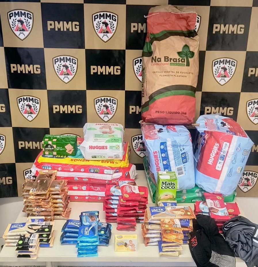 Foram recuperados: 17 barras de chocolate Alpino, 8 barras de chocolate Lacta Laka com Diamante Negro, 9 barras de chocolate Lacta Oreo, 14 barras de chocolate Lacta Laka Caramelo, 27 barras de chocolate Nestlé Classic, 1 sabonete Pom Pom, 1 litro de água de coco, 1 pacote de biscoito Paraquê, 3 pacotes de fraldas Huggies, 1 pacote de fraldas Personal, 2 pacotes de fraldas Pampers, 1 bermuda, 1 pacote de carvão (3 kg), além de 2 celulares, 1 veículo e 1 blusa.