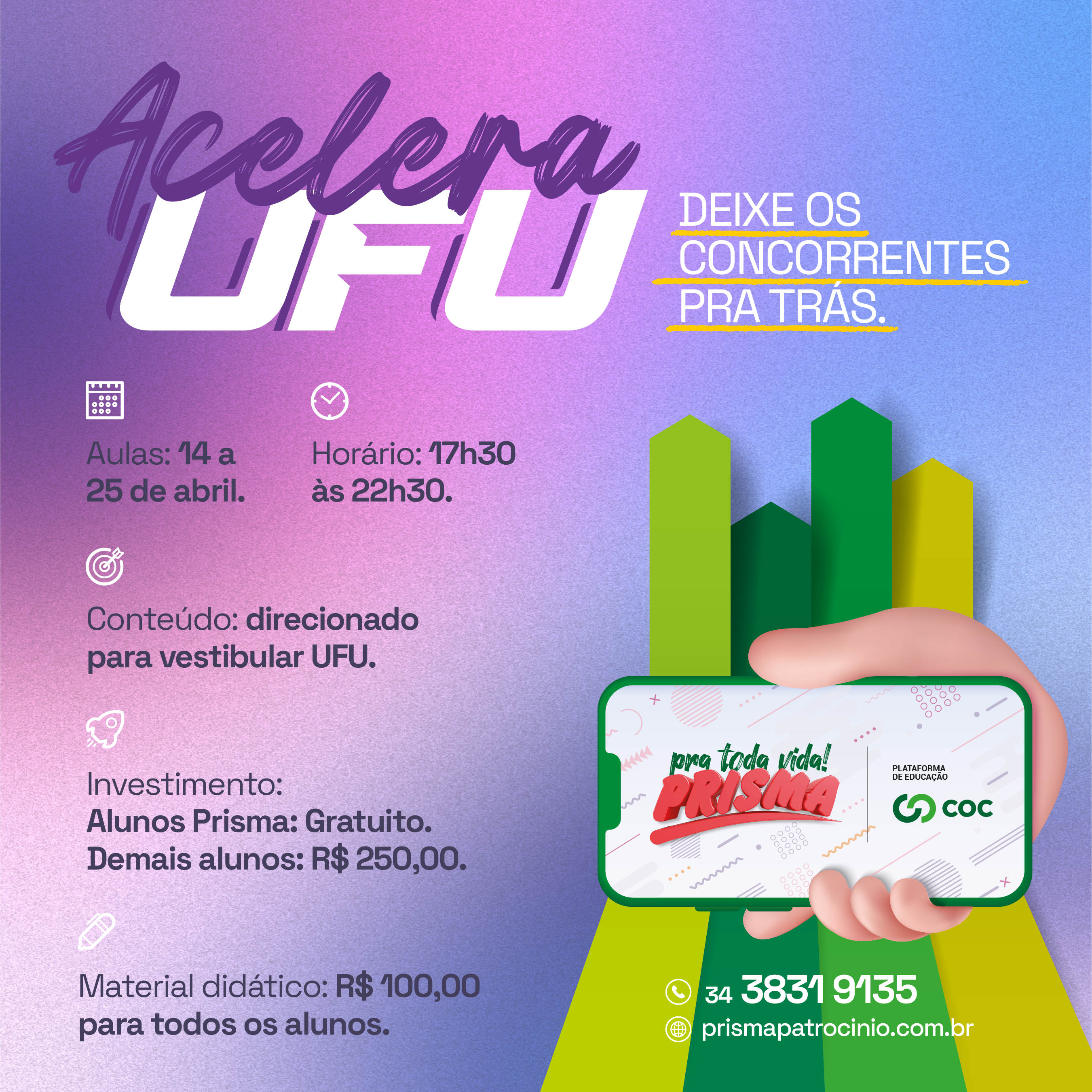 Reconhecido por ser campeão em aprovações nas universidades federais nos últimos anos, o Colégio Prisma lança o ACELERA UFU, curso preparatório intensivo para a 1ª fase do vestibular da UFU - Universidade Federal de Uberla?ndia, que acontece dia 27 de abril de 2025.