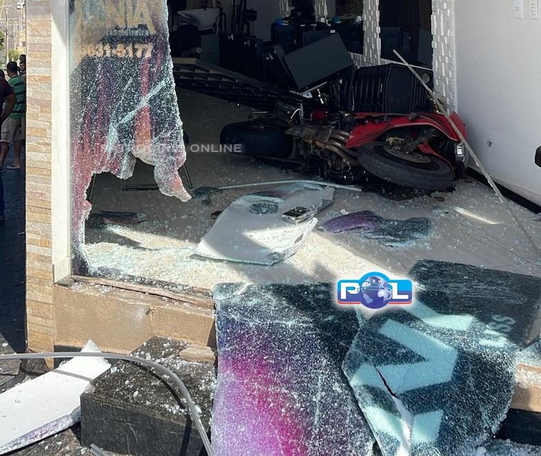 Com o acidente, a motocicleta quebrou a porta de vidro e a grade de proteção, parando dentro do estabelecimento, que ainda estava fechado, enquanto a XRE arrancou a roda.