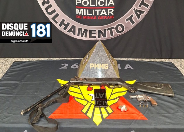 Os policiais, dando continuidade às diligências, realizaram buscas na residência do suspeito, onde apreenderam duas armas de fogo calibre .22 (um revólver e uma espingarda adaptada), munições e um tablete de maconha, além de um celular.