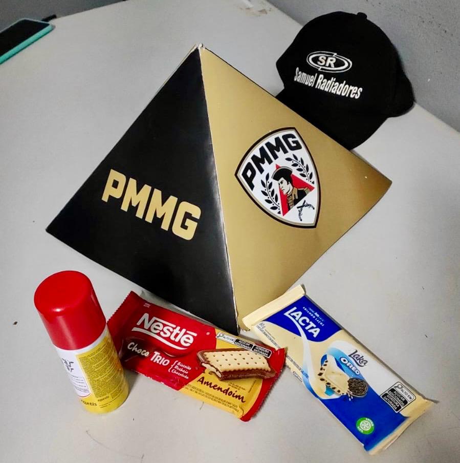 Ao verificar o sistema de monitoramento, foi constatado que o suspeito havia furtado barras de chocolate de diferentes marcas e um frasco de medicamento em spray.