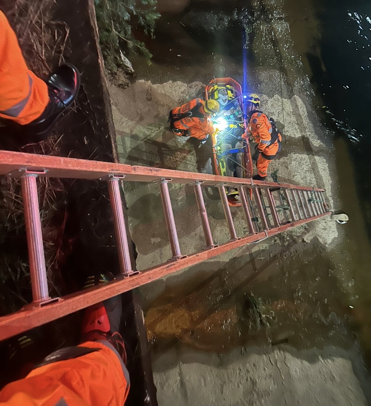 Para garantir a segurança durante a retirada, a vítima foi imobilizada em prancha longa, conforme protocolo, e acondicionada em maca tipo cesto. A operação de resgate contou com a utilização de escada deslizante como via de acesso e sistema de vantagem mecânica para o içamento seguro.