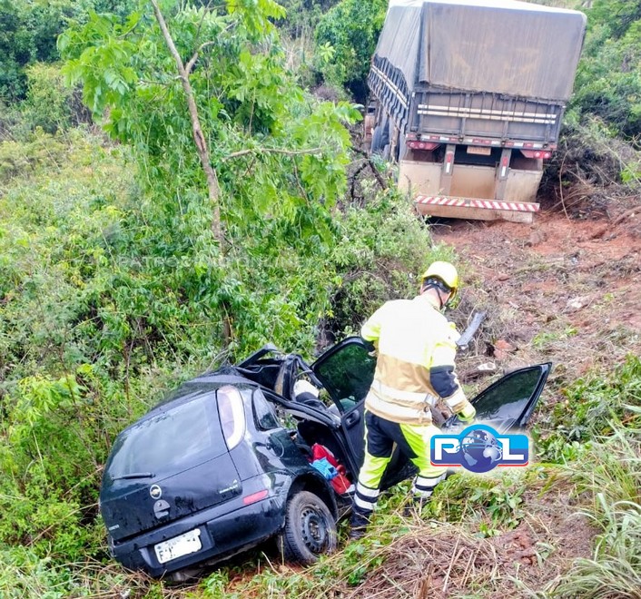 No local, a equipe de bombeiros deparou-se com ambos os veículos em uma ribanceira, fora da pista de rolamento.