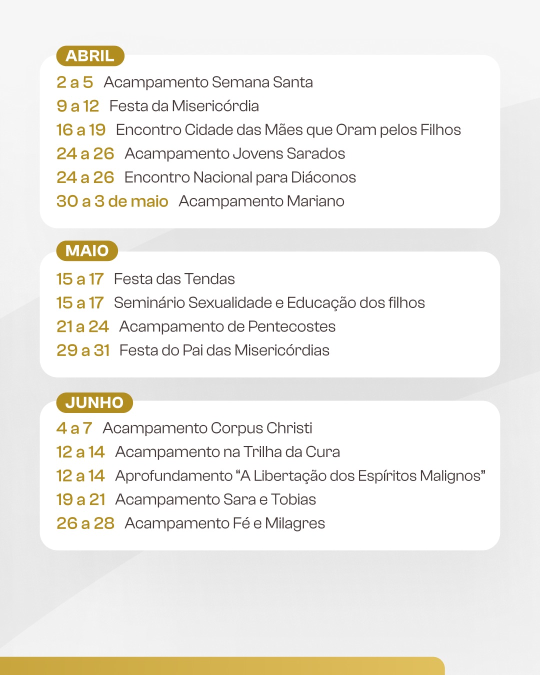 Outro destaque da programação são os encontros: Nacional da RCC – ENF (janeiro), Famílias em Pé (fevereiro), Mães que Oram pelos Filhos (abril), Mundial do Charis (agosto), Movimento Sacerdotal Mariano (setembro).
