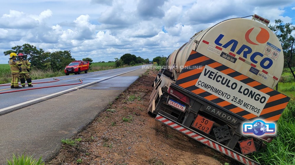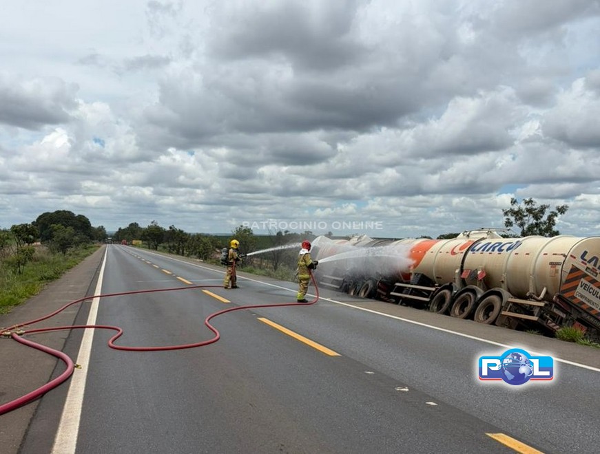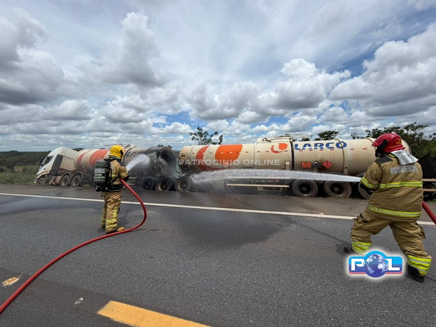 Os militares do Corpo de Bombeiros foram acionados para uma ocorrência de tombamento de uma carreta carregada com combustível que pegou fogo na BR-365, entre o trevo de acesso a São Gonçalo do Abaeté e o entroncamento com a BR-040, no distrito de Luizlândia do Oeste, na manhã desta quinta-feira, 15/1/26. Uma fumaça densa se formou no local.