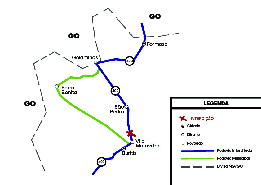 A Prefeitura de Formoso e o Departamento de Estradas de Rodagem de Minas Gerais (DER-MG) informaram que a rodovia MG-400 encontra-se totalmente interditada no trecho que liga os municípios de Formoso e Buritis, na região Noroeste do estado. A interdição afeta o tráfego entre Passa Três e Vila Maravilha, impossibilitando a passagem para São Pedro do Passa Três e Formoso (MG).