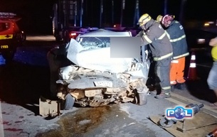 Três feridos em colisão frontal entre Gol e caminhão na BR-146, no trevo de Catiara, mobiliza equipes de resgate.