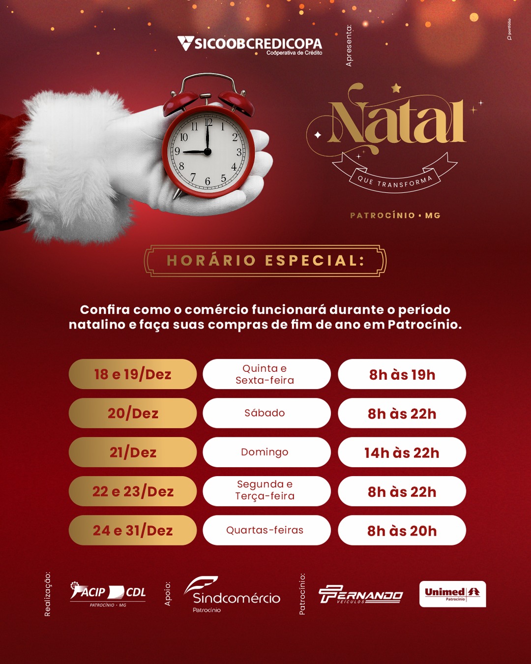 A ACIP/CDL, em parceria com o Sindcomércio, divulgou o horário especial de funcionamento do comércio de Patrocínio para o período de Natal. A programação tem como objetivo facilitar as compras de fim de ano, oferecendo mais comodidade aos consumidores e contribuindo para o fortalecimento do comércio local.