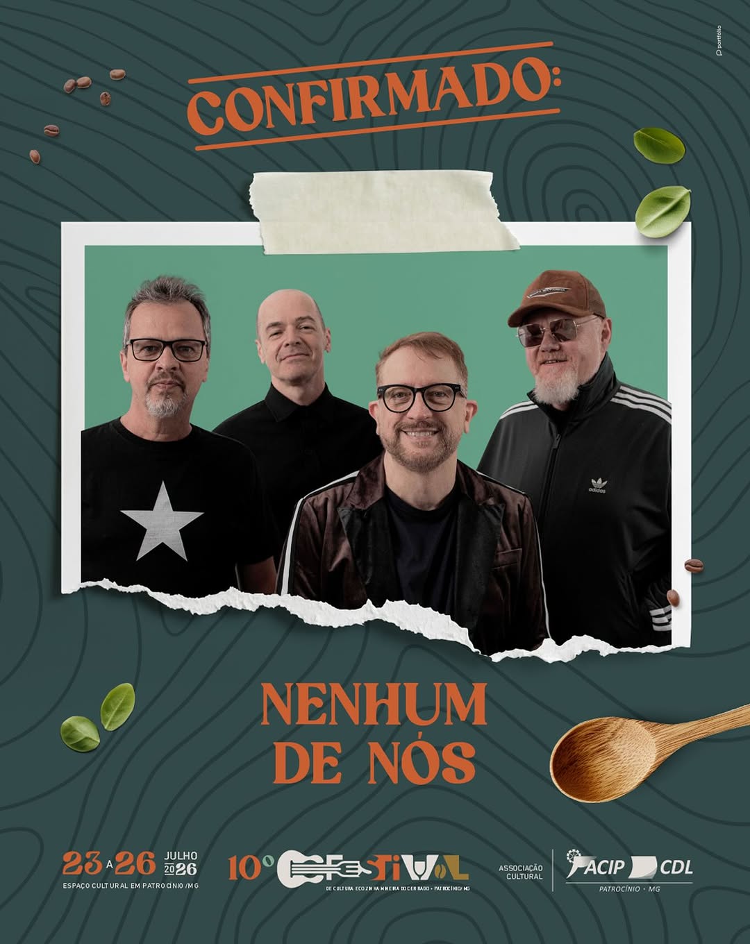 A ACIPCDL divulgou em suas redes sociais que o 10º Festival de Cultura e Cozinha Mineira do Cerrado será realizado entre os dias 23 e 26 de julho de 2026, no Espaço Cultural de Patrocínio, e já confirmou a banda Nenhum de Nós como uma das atrações principais.