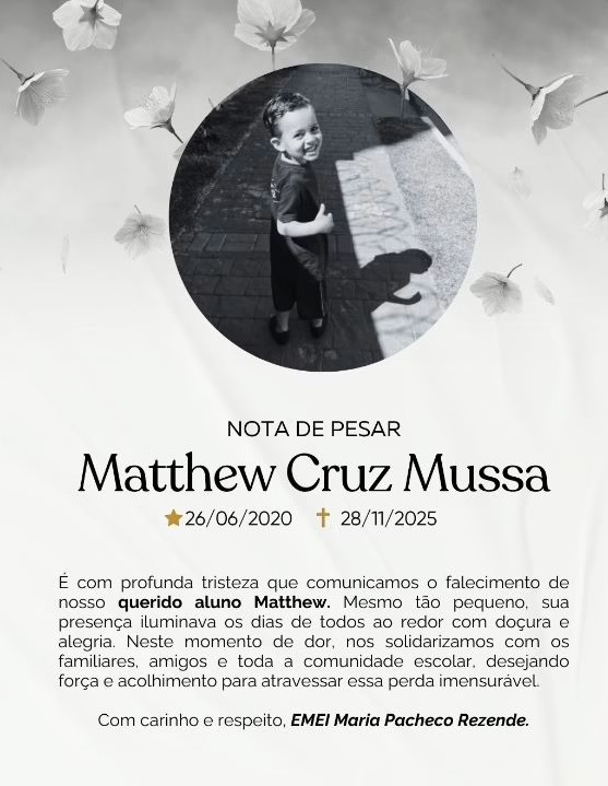 “É com profunda tristeza que comunicamos o falecimento de nosso querido aluno Matthew. Mesmo tão pequeno, sua presença iluminava os dias de todos ao redor com doçura e alegria. Neste momento de dor, nos solidarizamos com os familiares, amigos e toda a comunidade escolar, desejando força e acolhimento para atravessar essa perda imensurável.