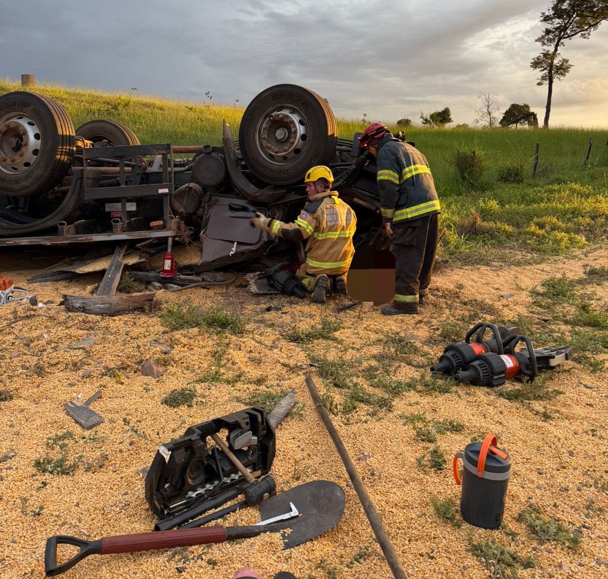 Para agilizar o desencarceramento das vítimas, foi necessário o apoio de um guincho para destombamento da carreta, possibilitando o acesso seguro pela equipe do Corpo de Bombeiros Militar.