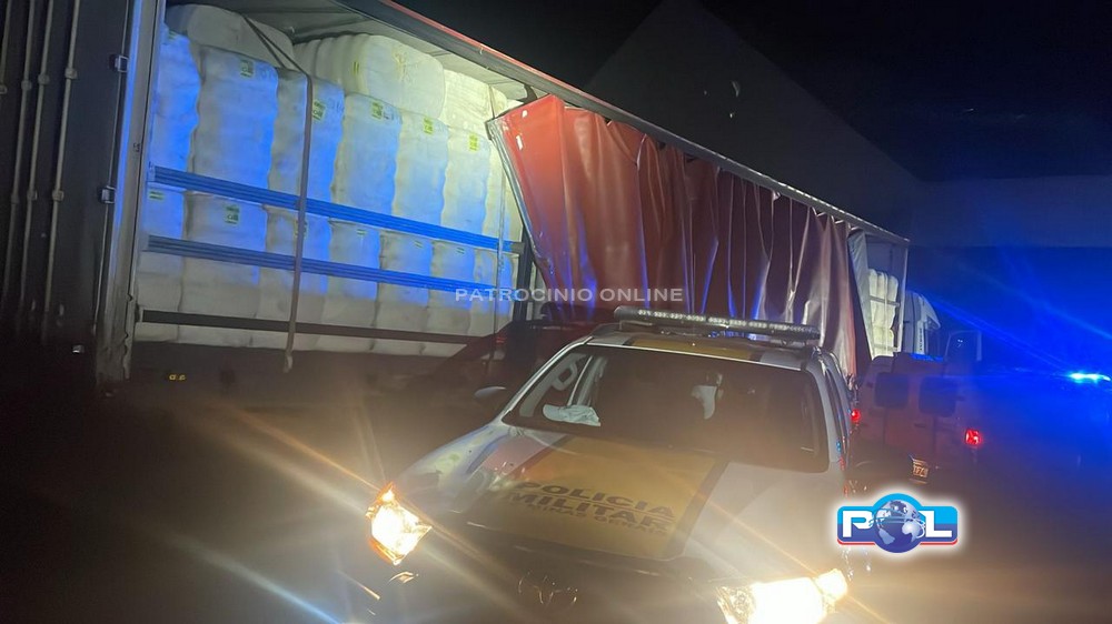 A carga, avaliada em R$ 370 mil reais, foi descarregada no pátio da algodoeira, e o caminhão e o semirreboque foram apreendidos por adulteração/clonagem.