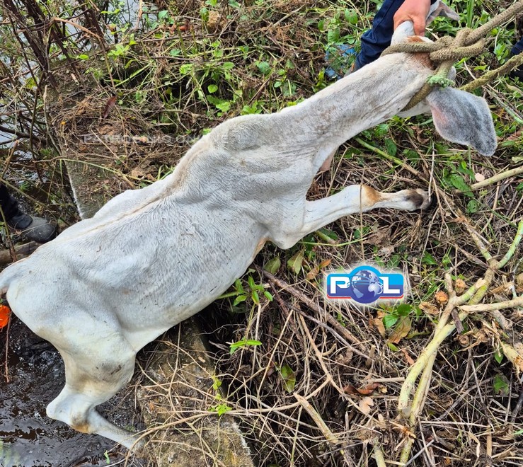 O bezerro foi resgatado sem ferimentos aparentes e, após o atendimento, foi entregue ao seu proprietário.