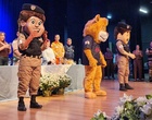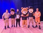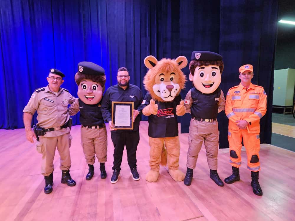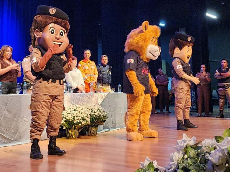 Um dos pontos altos do evento foi o ato de materialização do recebimento da doação de novos mascotes do Proerd: o PM Amigo Legal, a PM Amiga Legal e o leão Daren.