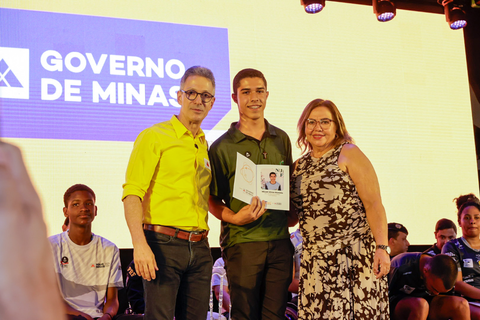 Os alunos Heitor Martins, do 1º ano do Ensino Médio da Escola Dalva Stela de Queiroz, de Patrocínio, e Micael Alves Honório, da Escola Estadual Irmãos Guimarães, de Guimarânia, receberam das mãos do governador Romeu Zema o passaporte simbólico que marca a conquista de uma vaga no programa Passaporte Mineiro do Conhecimento. A entrega aconteceu na segunda-feira, 6/10, durante a cerimônia de abertura dos Jogos Escolares Brasileiros (JEBs) 2025, em Uberlândia, e da entrega do certificado de Alfabetização Nota 10 para a Prefeitura de Uberlândia.