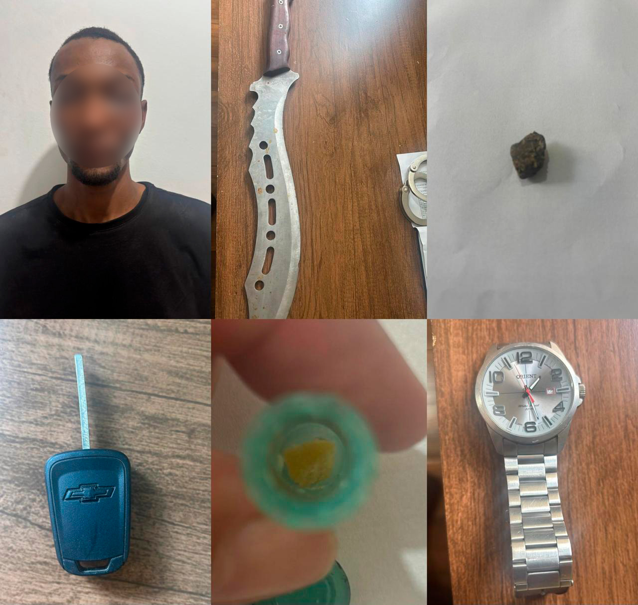 O autor foi localizado e abordado pela Polícia Militar na Avenida Joaquim Honório. Com ele, foram encontrados um relógio da marca Orient, parte do dinheiro subtraído, as chaves do carro da vítima e substâncias análogas a crack e maconha. Uma testemunha declarou à polícia que viu quando o suspeito chegou a um bar próximo logo após o crime e comentou sobre o fato.