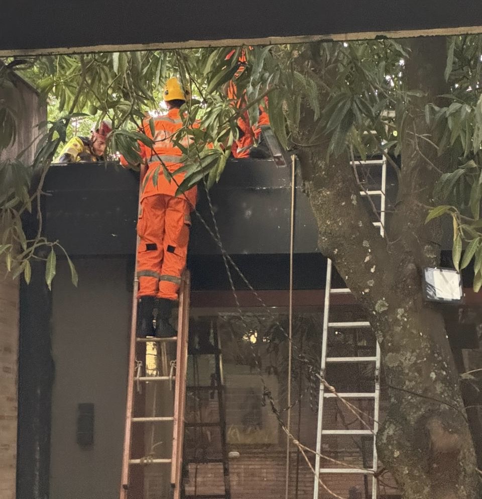 Devido ao difícil acesso ao telhado, foi necessária a montagem de uma rota segura, permitindo a estabilização da vítima e sua descida em segurança, utilizando técnicas e equipamentos específicos de salvamento em altura.