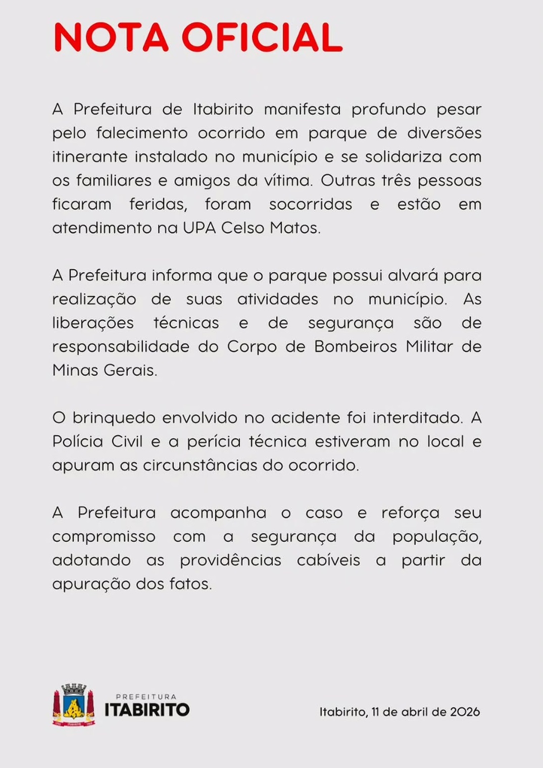 Em nota oficial divulgada neste sábado (11), a Prefeitura de Itabirito manifestou pesar pela morte da jovem e informou que o parque de diversões itinerante possuía alvará para funcionamento no município. A administração municipal afirmou que as liberações técnicas e de segurança são de responsabilidade do Corpo de Bombeiros Militar de Minas Gerais.