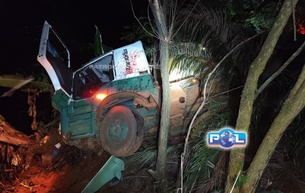 Após pneu estourar, condutor perde controle de caminhão, que sai da pista e colide com árvores na BR-365, no município de Patrocínio.