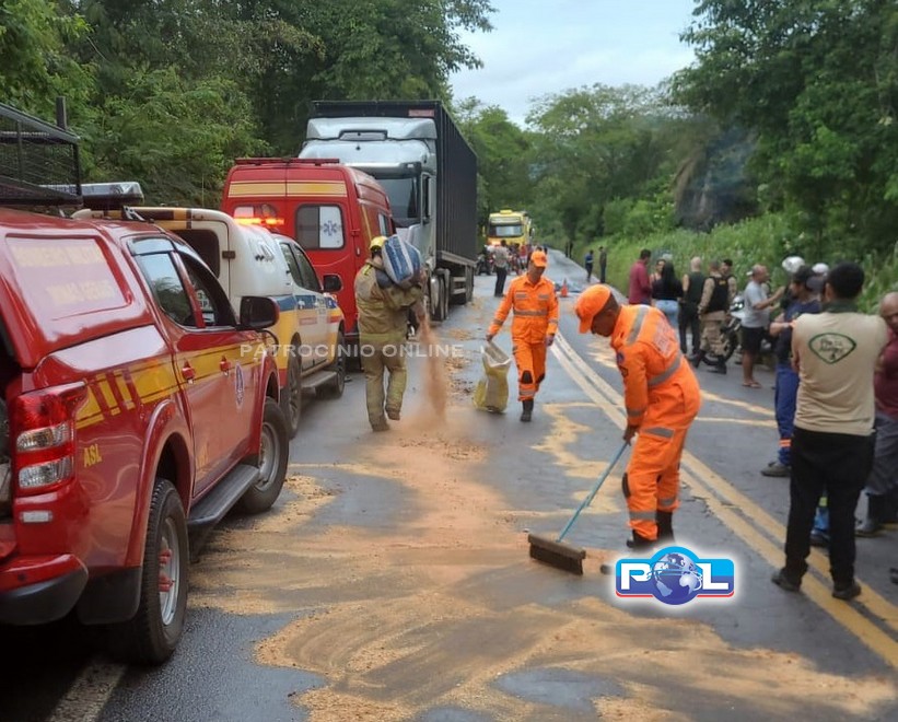 Outra guarnição de bombeiros espalhou serragem na pista, que está escorregadia devido ao vazamento de óleo.