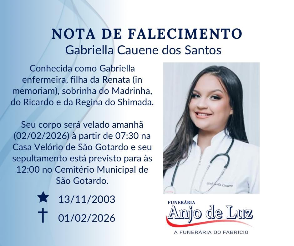 Será sepultada nesta segunda-feira, 02/02/2026, às 12h00min, no Cemitério Municipal de São Gotardo.