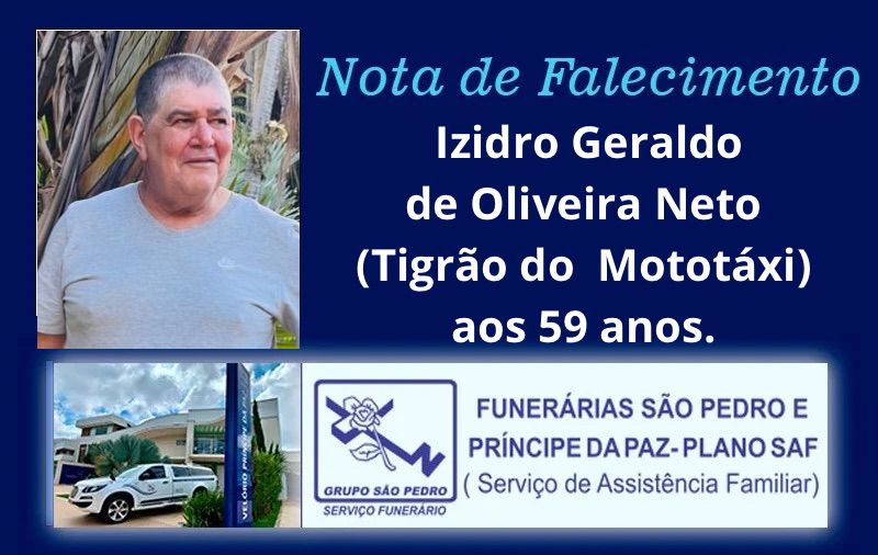 Faleceu hoje dia 09/10/2025, Izidro Geraldo de Oliveira Neto (Tigrão do Mototáxi) aos 59 anos.