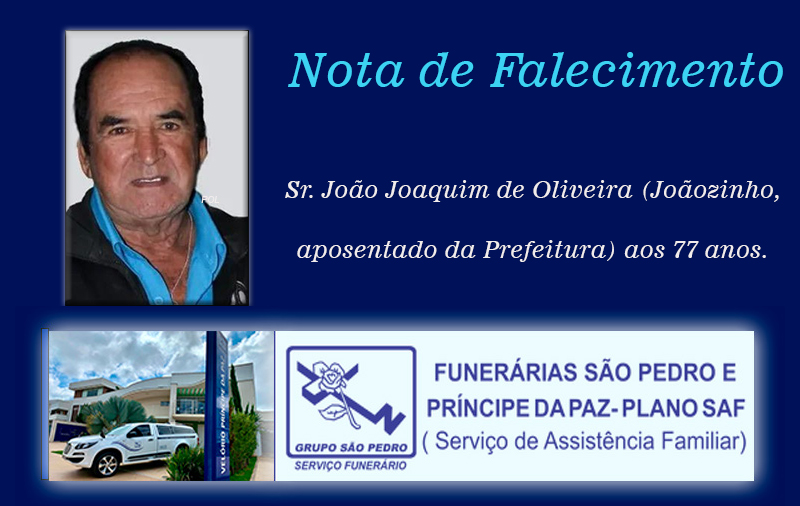 Faleceu nesta quinta-feira, 19/02/2026, em Araguari/MG, Sr. João Joaquim de Oliveira (Joãozinho, aposentado da Prefeitura) aos 77 anos.