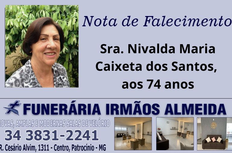 Faleceu hoje, em Patrocínio, a Sra. Nivalda Maria Caixeta dos Santos, aos 74 anos.