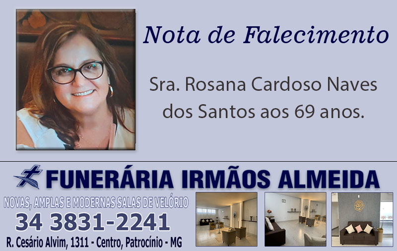 Faleceu neste sábado, 11 de abril de 2026, em Belo Horizonte/MG, a Sra. Rosana Cardoso Naves dos Santos aos 69 anos.