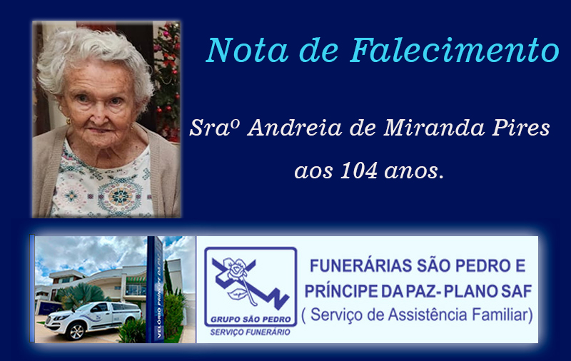 Faleceu nesta segunda-feira, 3 de novembro de 2025, em Patrocínio/MG, a Sraº Andreia de Miranda Pires aos 104 anos.