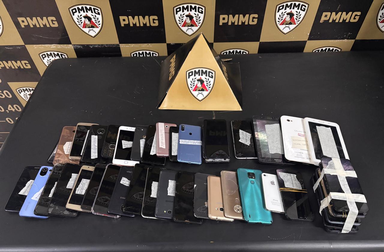 No local, após autorização para verificação dos aparelhos, constatou-se que parte dos dispositivos era produto de furto ou apresentava restrições, sem comprovação de procedência.