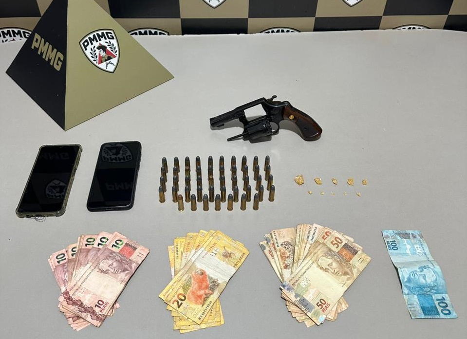 Foram apreendidos 10 pedras de crack, 01 revólver calibre .38, 47 munições calibre .38, 02 aparelhos celulares e R$ 2.160,00 reais.