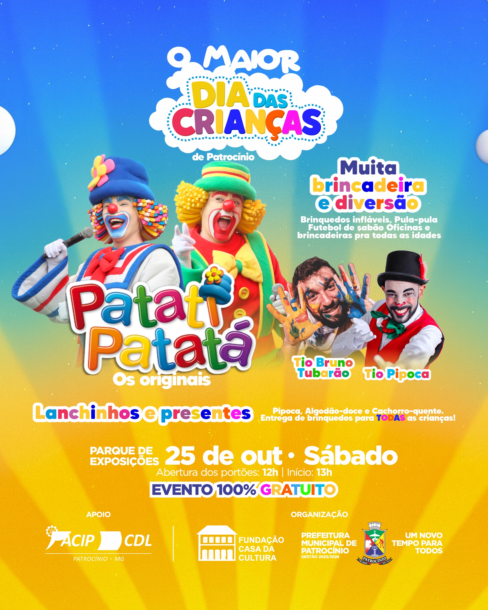 A programação é totalmente gratuita e promete uma tarde inesquecível para as famílias patrocinenses. Entre as atrações, destaque para os palhaços Patati Patatá – os originais –, que trarão ao público um show repleto de música, cor e alegria. Também sobem ao palco Tio Pipoca e Tio Bruno Tubarão, garantindo diversão do início ao fim.