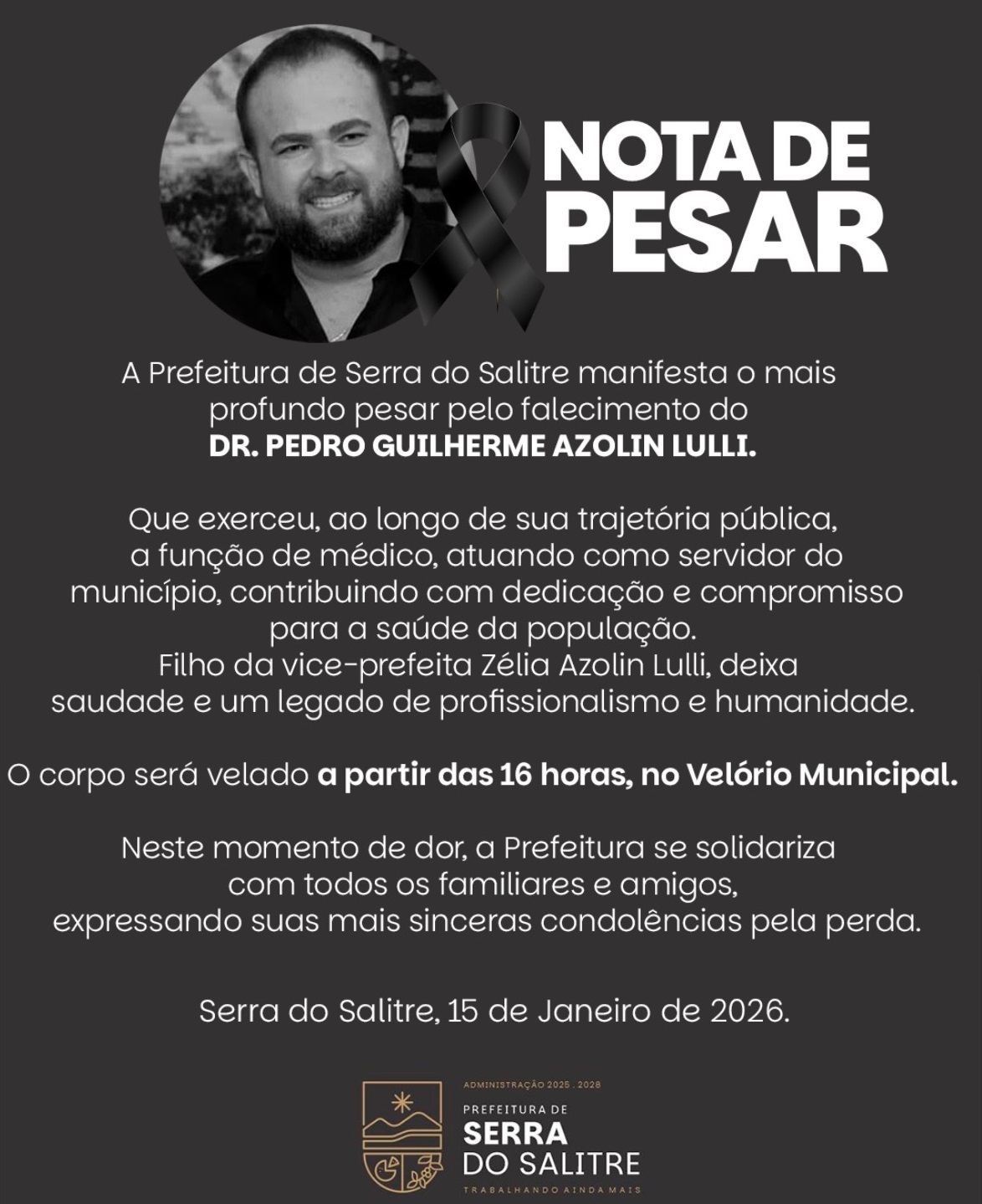 O velório do Dr. Pedro Lulli ocorrerá nesta quinta-feira, 15 de janeiro, a partir das 16h00min no Velório Municipal de Serra do Salitre. O horário do sepultamento será ás 10h00min desta sexta-feira, 16/1.
