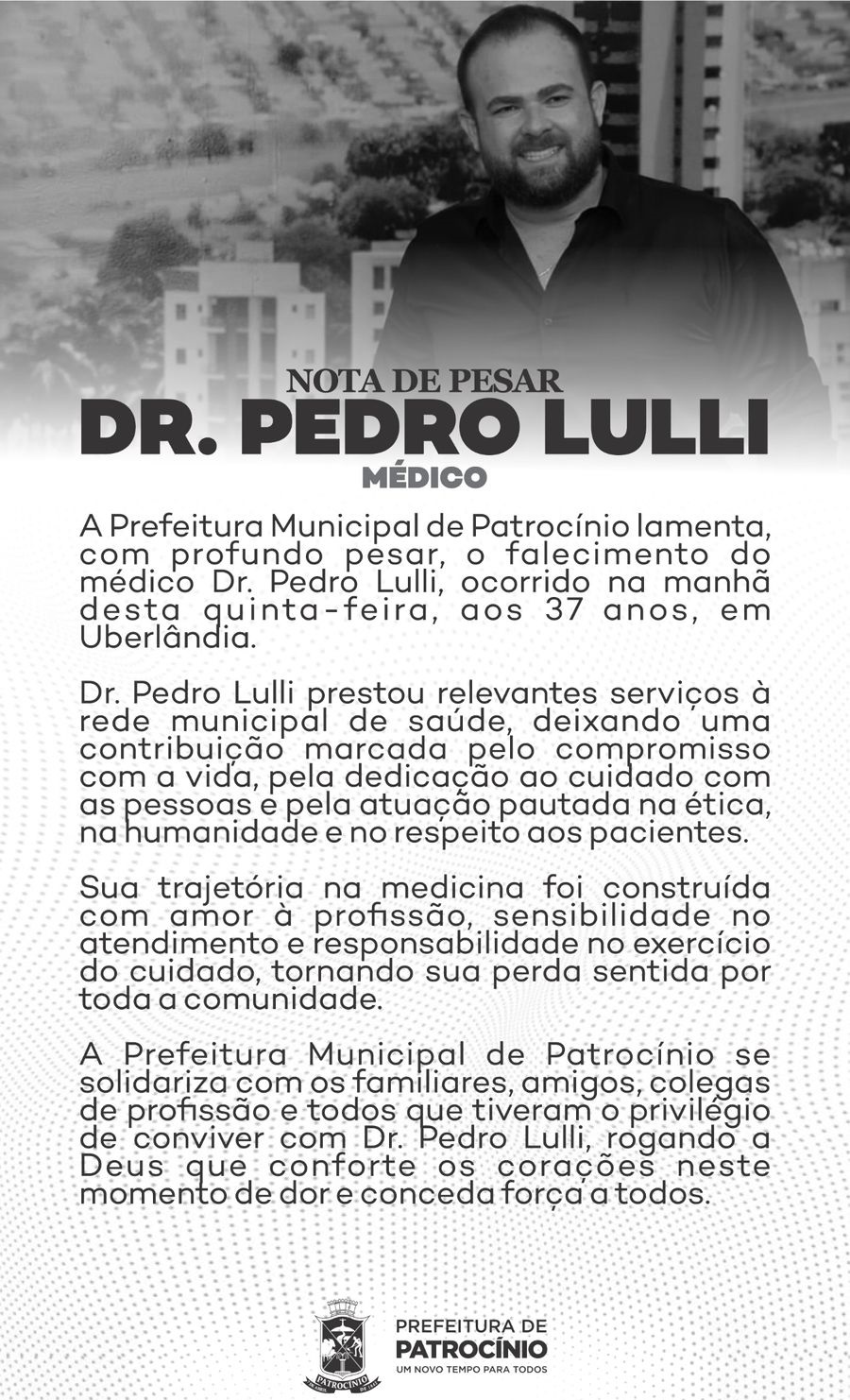 Já a Prefeitura de Serra do Salitre, terra natal do médico e onde sua família tem forte ligação, também publicou nota lamentando a perda. O texto enfatiza o legado de profissionalismo e humanidade deixado por Dr. Pedro, assim como sua atuação dedicada à saúde pública. A administração municipal se solidariza com os familiares e destaca a importância do médico para a população da região.