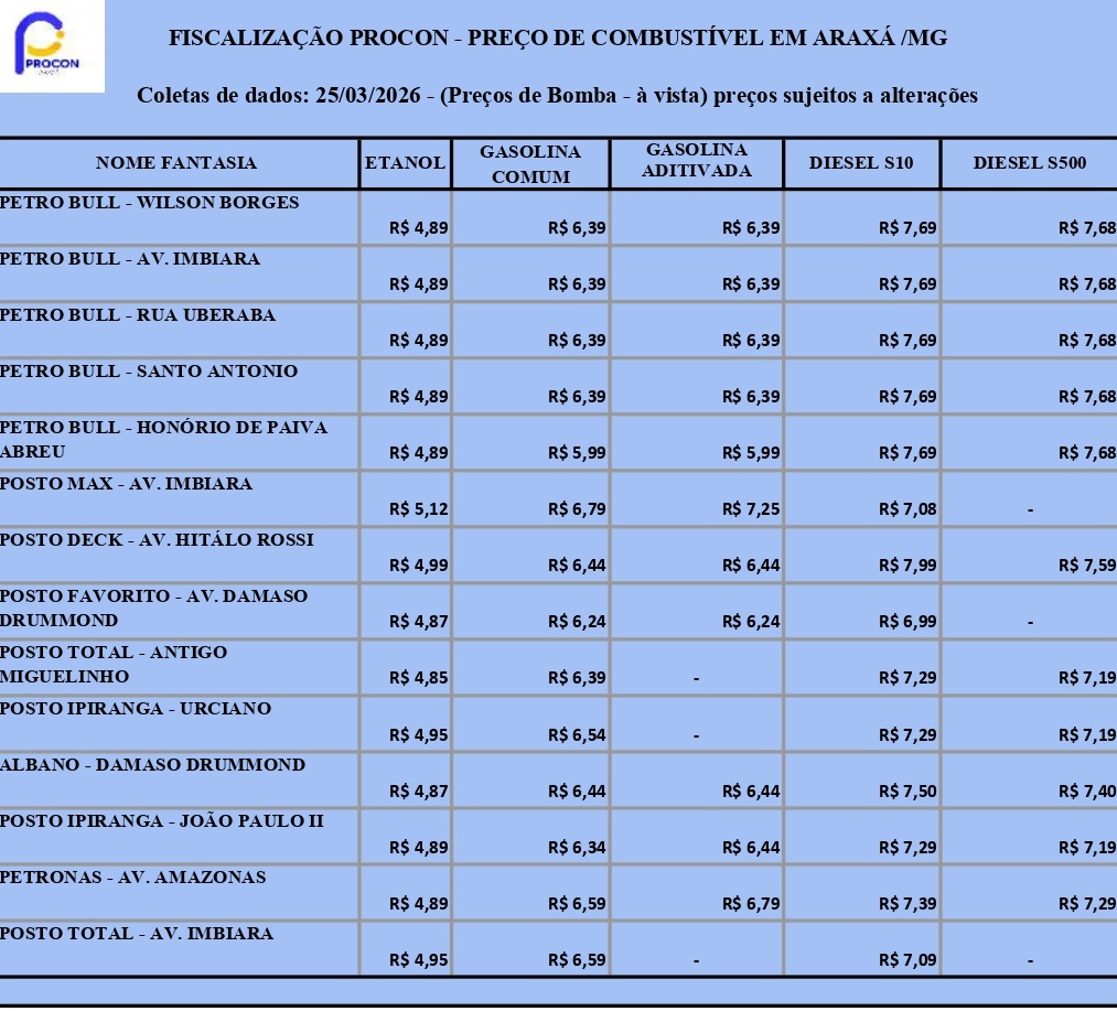 O Procon Araxá realizou, na quarta-feira 25/3, a mais recente pesquisa de preços dos combustíveis no município. Paralelamente às fiscalizações, o órgão está intensificando as ações sobre os valores praticados e notificou os postos para que apresentem documentos que comprovem e justifiquem os preços. A medida inclui o envio, no prazo de 10 dias, das notas fiscais de aquisição dos últimos 90 dias referentes à gasolina, etanol e diesel.