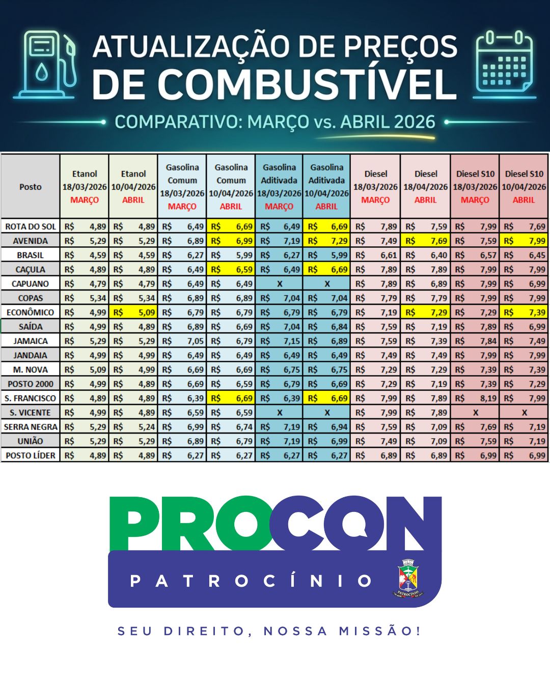 O Procon de Patrocínio divulgou, nesta sexta-feira (10), o resultado da pesquisa de preços de combustíveis realizada em 17 postos do município. O levantamento apresenta os valores praticados no dia 10 de abril de 2026 e inclui comparativo com dados coletados em 18 de março, permitindo acompanhar a variação dos preços no período.