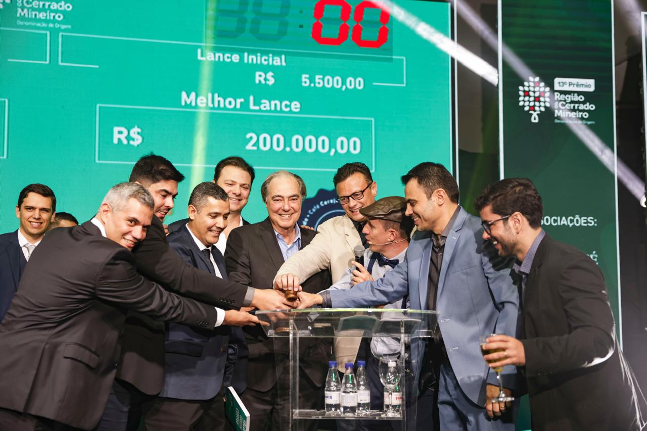 O Leilão Solidário, realizado durante a cerimônia presencial em Uberlândia, movimentou R$ 562 mil, com uma média de R$ 62,4 mil por saca. A saca campeã da categoria Cereja Descascado, produzida por Eduardo Pinheiro Campos, da Fazenda Dona Nenem, em Presidente Olegário, foi arrematada por R$ 200 mil — o maior valor já registrado por uma saca de café em um leilão nacional.