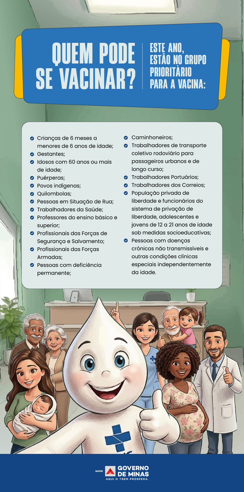 A vacinação é destinada aos grupos prioritários definidos pelo Ministério da Saúde, com destaque para crianças de 6 meses a menores de 6 anos, gestantes, idosos com 60 anos ou mais e puérperas. Também fazem parte do público-alvo povos indígenas e quilombolas, pessoas em situação de rua, trabalhadores da saúde e da educação, profissionais das forças de segurança e salvamento, além de pessoas com comorbidades e deficiência permanente.