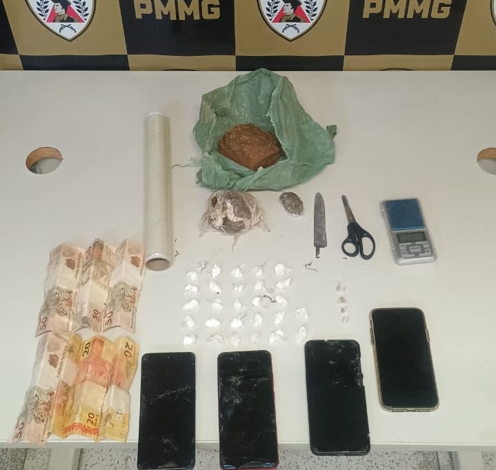 Foram apreendidos 27 dolas de cocaína, meia barra de maconha, uma porção de “flor” de maconha, uma bucha de maconha, quatro pedras de crack, quatro celulares, uma balança de precisão, tesoura e faca, material para dolagem e R$ 260,00.