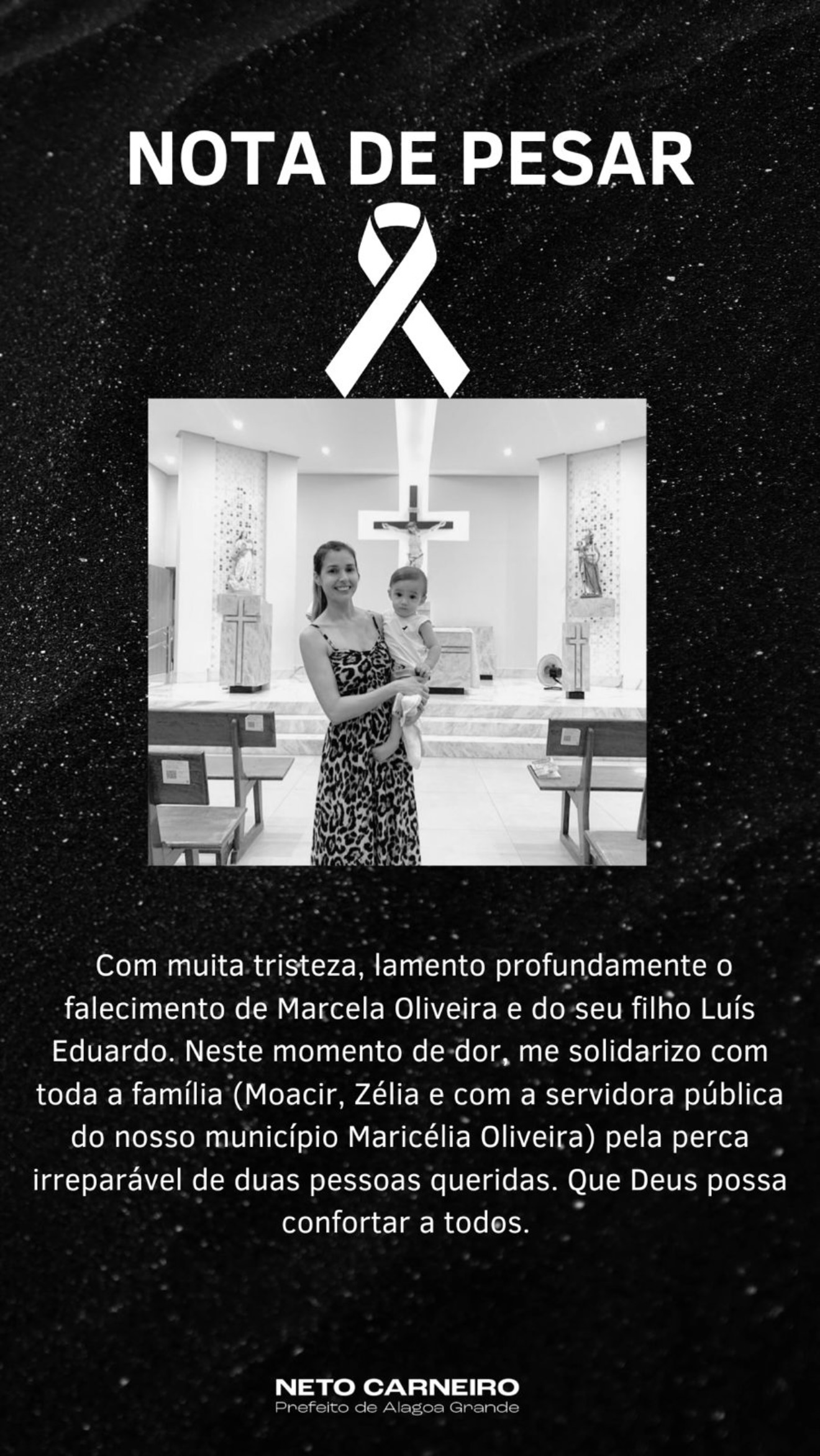 Nas redes sociais, o prefeito de Alagoa Grande, Neto Carneiro (PRD), divulgou uma nota de pesar lamentando a morte de Marcela e do filho, e se solidarizou com os familiares.