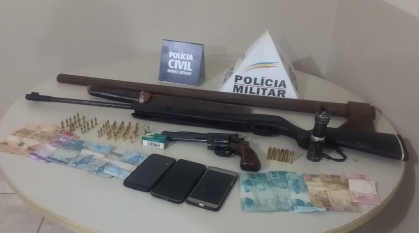 Com os homens foram localizadas uma espingarda calibre 22., um revólver calibre 38, quarenta e duas munições calibre 22 intactas, seis munições calibre 38 intactas, uma faca, um facão, um machado, 03 aparelhos celulares e certa quantia em dinheiro.