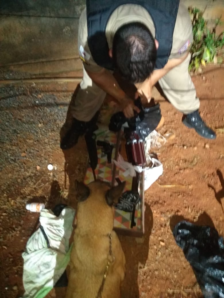 Durante a ação, os cães de faro Pandora e Kratus deram indicativos de drogas em um sofá, sendo encontrado pelo quatro tabletes de maconha. Em um monte de lenhas localizado nos fundos do imóvel, localizada uma balança de precisão em pleno funcionamento.