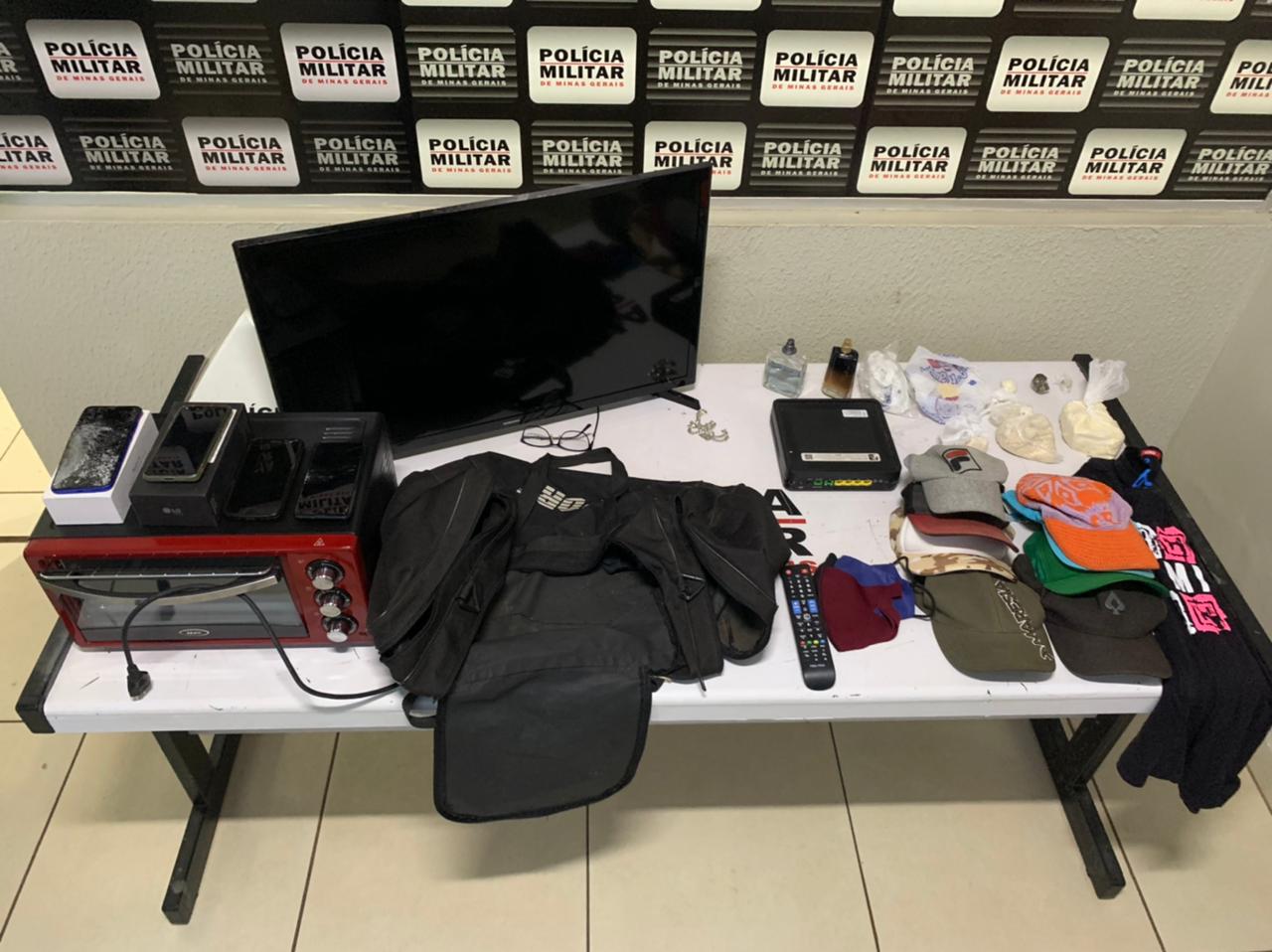 Em continuidade às buscas, foi apreendido um telefone celular LG K 8, com capinha feminina, reconhecido e de propriedade das vitimas e 01 sacola plástica contendo no interior 01 pedaço grande e 02 pedaços pequenos de pasta base, 01 sacola plástica contendo a mesma substância esfarelada, 02 buchas de maconha e diversas roupas, televisão e outros materiais possivelmente provenientes de crime e utilizados para a prática de delitos.