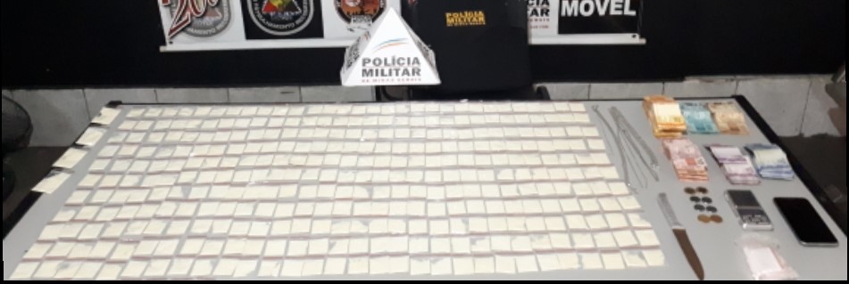 MONTE CARMELO (MG) - No dia 14/03/21, por 21h30min, no Centro, no município de Monte Carmelo, a Polícia Militar após receber denúncia de aglomeração, som alto e tráfico de drogas, iniciou diligências e durante busca no imóvel aprendeu R$ 18.152,00 reais, 16 pedras de crack, 01 porção grande de cocaína em pó (25 gramas), 500 unidades de pinos para armazenar cocaína, 03 sacolas de para refino de cocaína, somando aproximadamente 3kg, 01 rolo de papel insulfilm, 01 balança de precisão, 1 celular e uma caixa de som.