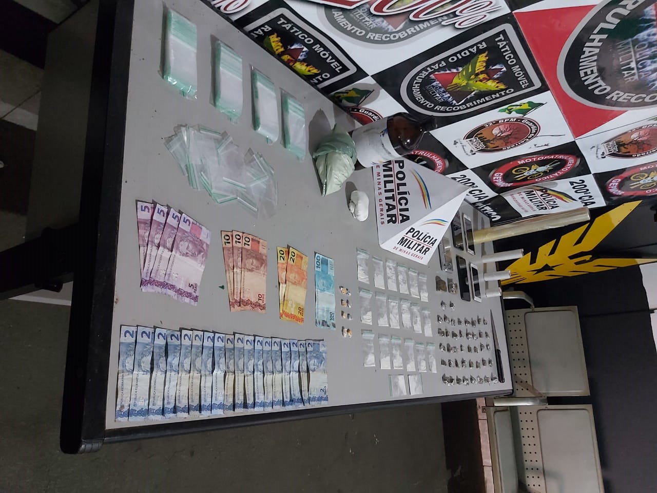A guarnição foi até o local e após buscas consentidas localizou 42 buchas de maconha, embaladas e prontas ao comércio, dois tabletes de maconha, 20 papelotes de cocaína, oito comprimidos de ecstasy, um vidro contendo loló, duas porções de ácido bórico, uma balança de precisão, quatro rolos de papel filme usados para embalar a maconha, uma faca, quatro pacotes com zip-lock usados para acondicionar a cocaína, R$ 226,00 reais e quatro celulares.