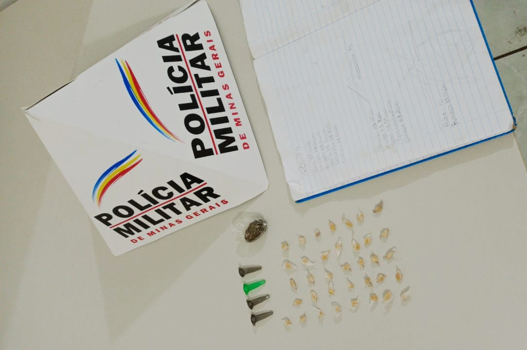 Com a situação de flagrante, prosseguindo com as diligências a PM localizou durante as buscas na residência 36 pedras de crack, 04 embalagens plásticas pinos, comumente utilizados para armazenar cocaína, 01 bucha de maconha e 01 caderno de anotações contendo nome de usuários conhecidos e informações das movimentações financeiras provenientes da comercialização de drogas.