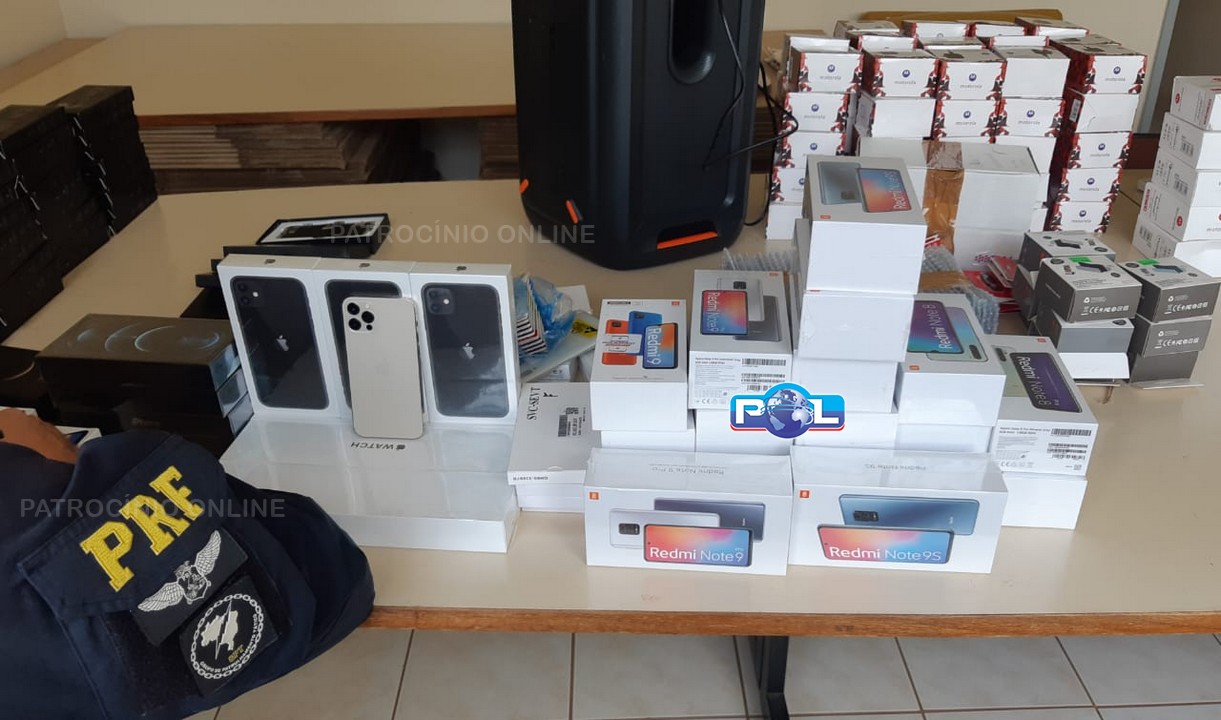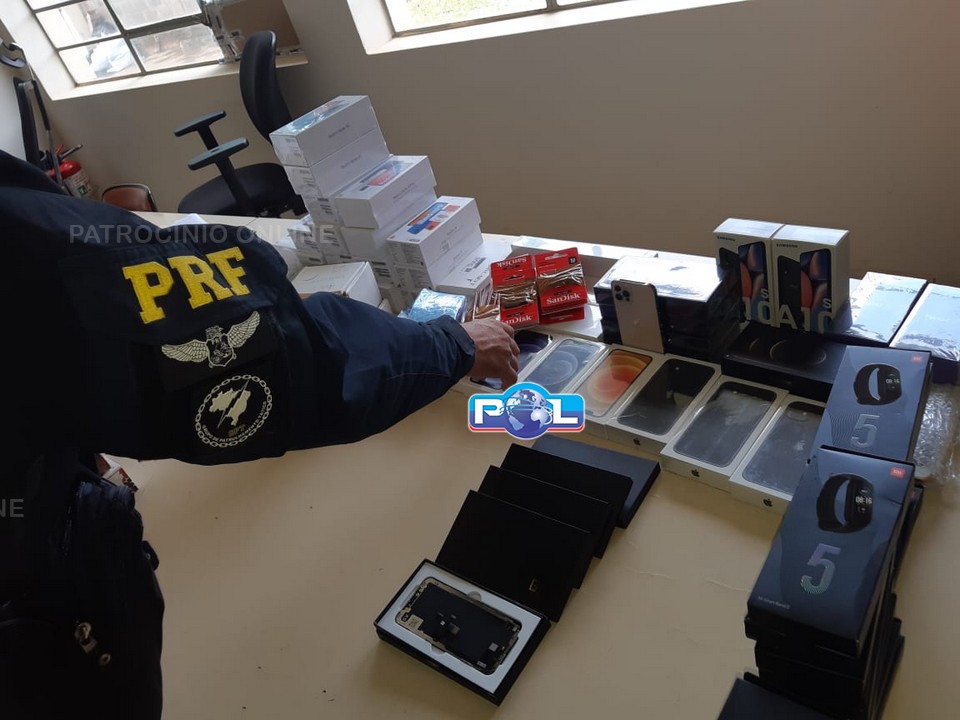 No porta malas do veículo eram transportadas mercadorias oriundas do Paraguai, dentre elas celulares que chegam a custar em torno de dez mil reais a unidade no mercado nacional.